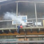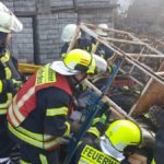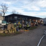 So lautete die Beschreibung des Szenarios beim Eintreffen der ersten Einsatzkräfte am Übungsobjekt. Zugführer Timo Schröder hatte mit Hilfe der Betriebsleiter diese Übungslage vorbereitet und über einen „Not(An)ruf“ den Löschzug der Schwerpunkfeuerwehr alarmiert. Während Trupps mit Atemschutzgeräten zur Personensuche und Brandbekämpfung in die – durch eine Nebelmaschine – verrauchte Halle eindrangen, leisteten andere Einsatzkräfte zunächst der eingeklemmten Person im Außenbereich erste Hilfe. Kurz danach begannen Feuerwehrleute die technische Rettung und setzten hydraulische Hebewerkzeuge und Rüstholz ein, um die schweren „Gerüstteile“ anzuheben. Noch während der Rettung der engeklemmten Person stiegen andere Einsatzkräfte über eine tragbare Leiter auf den Balkon und retten die dort vom Brand unmittelbar gefährdete Person (Puppe). Atemschutztrupps im Innenangriff erkundeten zugleich in der Halle und suchten nach weiteren Personen. Da sich das Feuer in dem überwiegend aus Holz gebauten Gebäude rasant ausbreitete, musste der Innenangriff abgebrochen werden. Aufgrund der „Durchzündung“ mussten sich alle Einsatzkräfte schnell aus dem Gebäude zurückziehen und nun ausschließlich von außen „löschen“. Während der Einsatzmaßnahmen meldete ein eingesetzter Atemschutztrupp einen „Notfall“. Hierauf reagierten die anderen Einsatzkräfte mit speziellen Maßnahmen, die für einen solchen „Atemschutznotfall“ ständig trainiert werden. Zur Abriegelung eines Nachbargebäudes setzte die Feuerwehr mehrere Rohre im Außenangriff ein. Hierzu musste Wasser über Schlauchleitungen aus Hydranten im Gewerbegebiet auf das Gelände gepumpt werden. Schon kurz danach zeigten die umfangreichen Maßnahmen Wirkung und das (virtuelle Übungs-) Feuer war gelöscht. Die Funker im Einsatzleitwagen konnten nun die letzte Lagemeldung „Feuer aus“ entgegennehmen und dokumentieren.