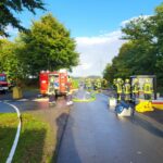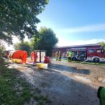„An einem Feldweg hatten zwei Personen unsachgebäß mit Chemikalien hantiert und sich hierbei Verletzungen durch Verätzungen und Atemgifte zugezogen“, so die Beschreibung der fiktiven Lage von der Übungsleitung vor Ort. Sofort sperrten die ersten Einsatzkräfte einen Gefahrenbereich weiträumig ab, stellten den Brandschutz sicher und schickten einen mit Atemschutzgeräten geschützen Einsatztrupp zu Menschenrettung vor. Am Rand des Feldweges fanden die Feuerwehrleute zwei „Verletzte“ auf, die sie aus dem Gefahrenbereich retteten. An einer schnell aufgebauten provisorischen „Notdekontamiationsstelle“ wurden die beiden Patienten „entkleidet und grob gereinigt“, um sie danach ohne weitere Kontaminationsgefahr an den Rettungsdienst übergeben zu können. Gleichzeitig rüsteten sich weitere Einsatzkräfte mit speziellen Chemikalien-Schutz-Anzügen (CSA) aus, während parallel eine große Dekontaminationsstelle mit mobiler Dusche und Umkleidezelt sowie eine Löschwasserversorgung aufgebaut wurden. Ein mit CSA geschützter Trupp erkundete danach den Bereich, in dem der Austritt von Chemikalien zu vermuten war. Hierbei fanden sie in einem Feldgraben drei Kanister mit Gefahrenkennzeichnungen und nahmen Messungen mit speziellen Gasmessgeräten vor. Anhand der übermittelten Daten zu den Kanistern und Inhalten ermittelte die Besatzung des Einsatzleitwagens die spezifischen Stoffangaben, Gefahren und mögliche Maßnahmen. Von einem Bereitstellungsplatz für spezielle Geräte erhielt in weiterer CSA-Trupp Hilfsmittel, mit denen sie am Unfallort die Kanister sichern und eine weitere Gefahr verhindern konnten. Nachdem die CSA-Trupps ihre Einsatzaufträge erfolgreich absolviert und die Dekontamination erfolgt war, endete die aufwendige Gefahrgutübung.