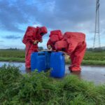 „An einem Feldweg hatten zwei Personen unsachgebäß mit Chemikalien hantiert und sich hierbei Verletzungen durch Verätzungen und Atemgifte zugezogen“, so die Beschreibung der fiktiven Lage von der Übungsleitung vor Ort. Sofort sperrten die ersten Einsatzkräfte einen Gefahrenbereich weiträumig ab, stellten den Brandschutz sicher und schickten einen mit Atemschutzgeräten geschützen Einsatztrupp zu Menschenrettung vor. Am Rand des Feldweges fanden die Feuerwehrleute zwei „Verletzte“ auf, die sie aus dem Gefahrenbereich retteten. An einer schnell aufgebauten provisorischen „Notdekontamiationsstelle“ wurden die beiden Patienten „entkleidet und grob gereinigt“, um sie danach ohne weitere Kontaminationsgefahr an den Rettungsdienst übergeben zu können. Gleichzeitig rüsteten sich weitere Einsatzkräfte mit speziellen Chemikalien-Schutz-Anzügen (CSA) aus, während parallel eine große Dekontaminationsstelle mit mobiler Dusche und Umkleidezelt sowie eine Löschwasserversorgung aufgebaut wurden. Ein mit CSA geschützter Trupp erkundete danach den Bereich, in dem der Austritt von Chemikalien zu vermuten war. Hierbei fanden sie in einem Feldgraben drei Kanister mit Gefahrenkennzeichnungen und nahmen Messungen mit speziellen Gasmessgeräten vor. Anhand der übermittelten Daten zu den Kanistern und Inhalten ermittelte die Besatzung des Einsatzleitwagens die spezifischen Stoffangaben, Gefahren und mögliche Maßnahmen. Von einem Bereitstellungsplatz für spezielle Geräte erhielt in weiterer CSA-Trupp Hilfsmittel, mit denen sie am Unfallort die Kanister sichern und eine weitere Gefahr verhindern konnten. Nachdem die CSA-Trupps ihre Einsatzaufträge erfolgreich absolviert und die Dekontamination erfolgt war, endete die aufwendige Gefahrgutübung.