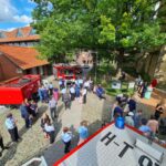 Nachdem sich Silke und Jan das Ja-Wort gegeben und die Eheringe aufgesteckt hatten, empfingen Feuerwehrleute das frisch vermählte Paar vor der Margarethenkirche in der Gehrdener Innenstadt. Durch ein Spalier von Mitgliedern der Jugendfeuerwehr, Einsatzkräften der Gehrdener Feuerwehr sowie der Werkfeuerwehr Continental wurde das Hochzeitspaar aus der Kirche geleitet. Indem die Eheleute ein Hindernis aus verknoteten und in einer Leiter verpflochtenen Schläuchen beseitigten, hatten sie ihren ersten gemeinsamen Ehe-Einsatz mit Bravour absolviert. Anschließend nahmen sie die vielen Glückwünsche der Hochzeitsgäste und ihrer Feuerwehrkameradinnen und – Kameraden entgegen. Silke und Jan sind beide aktive Mitglieder der Schwerpunktfeuerwehr Gehrden. Silke leitet zudem auch die Stadtjugendfeuerwehr. Somit ist auch erklärt, weshalb viele der Hochzeitsgäste aus den Reihen der Feuerwehr mit den beiden an diesem Tag anschließend ausgiebig feierten.