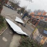 Ein großer Bauzaun war von heftigen Windböen umgeworfen und lag nun auf einem Fußweg. Feuerwehrleute entfernten die Hindernisse und sicherten lose Teile.