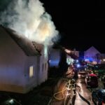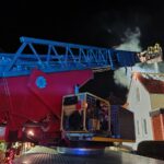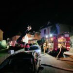 Mitten in der Nacht bemerkte ein Anwohner des Knülwegs einen unklaren Feuerschein, als er aus dem Fenster in Richtung der Lyrastraße und des sich anschließenden Waldes schaute. Aufgrund seiner ersten Notrufmeldung erreichte kurz danach die alarmierte Dienstgruppe mit dem Tanklöschfahrzeug die Wohnsiedlung am Friederich-Ebert-Platz. Die Einsatzkräfte stellten eine Rauchentwicklung im Knülweg fest. Beim Einbiegen in die Lyrastraße sahen sie dann den Dachstuhl eines Wohnhauses in hellen Flammen stehen. Sofort erhöhte der Einsatzleiter die Alarmstufe und rief so unter anderem den kompletten Löschzug der Kernstadt sowie die Drehleiter der Feuerwehr Ronnenberg zur Hilfe. Feuerwehrleute klingelten und klopften an den beiden Hauseingangstüren und weckten so zwei Bewohner im Erdgeschoss. Diese konnten sich hiernach unverletzt ins Freie retten. Den verschlossenen Hauseingang zum derzeit unbewohnten Obergeschoss mussten die Einsatzkräfte mit speziellem Werkzeug aufbrechen. Unmittelbar danach drangen mit Atemschutzgeräten geschützte Trupps in das Haus ein und bekämpften den Brand mit Wasser. Parallel löschten Feuerwehrleute von außen, auch über die Drehleiter. Durch die schnellen und gezielten Löschmaßnahmen war der Brand gegen 02:15 Uhr unter Kontrolle. Für die Nachlöscharbeiten mussten Dachsteine aufwendig entfernt werden. Hierzu gingen Atemschutztrupps über die Drehleiter und tragbare Leitern auf das Dach vor. Etwa zwei Stunden nach dem ersten Alarm war das Feuer vollständig gelöscht. Mit einem Wassersauger entfernten die Brandbekämpfer eingedrungenes Löschwasser aus den vom Feuer weitgehend unbeschädigten Wohnräumen. Das komplette Gebäude musste vom Stromnetz getrennt werden und ist derzeit unbewohnbar. Eine Mitarbeiterin der Stadt Gehrden kümmerte sich noch in der Nacht um eine provisorische Unterkunft für die Bewohner.