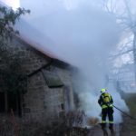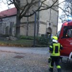 An der Margarethenkirche in der Stadtmitte nahmen Passanten Rauch wahr und entdeckten an einem Seiteneingang einen brennenden Strohballen. Während eine Frau über den Notruf die Feuerwehr alarmierte, besorgte sich ein Mann einen Feuerlöscher aus einem Kaffee auf dem Marktplatz. Als kurze Zeit später die Feuerwehr eintraf, war die Kirche in dichten Rauch gehüllt. Neben dem hilfsbereiten Mann hatte auch die Küsterin einen weiteren Feuerlöscher benutzt und so das Feuer im Außenbereich vor der Kirche etwas eindämmen, jedoch nicht löschen können. Ein Einsatztrupp ging mit Atemschutzgeräten geschützt vor und löschte das Feuer mit Wasser aus dem Tank eines Löschfahrzeuges. Zeitgleich stellte ein weiterer Atemschutztrupp in der Sakristei eingedrungenen Brandrauch fest. Mit Hilfe eines speziellen Druckbelüftungsgerätes bliesen Feuerwehrleute über den Haupteingang frische Luft in die Kirche und drückten so den Rauch aus dem Nebenraum. Durch die beherzte Reaktion der Ersthelfer sowie den schnellen und gezielten Einsatz der Feuerwehr konnten Schäden am Gebäude gerade noch verhindert werden. Zur Feststellung der Brandursache hat die Polizei vor Ort entsprechende Ermittlungen eingeleitet.
