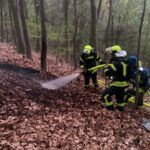 Anwohner des Friedrich-Ebert-Platzes meldeten über den Notruf 112 einen Waldbrand im Gehrden Berg auf der Nordseite des Burgberges. Als die ersten Einsatzkräfte eintrafen, wurden sie von mehreren Personen eingewiesen. Ein Mann hatte selbstständig versucht eine Ausbreitung des Feuers zu verhindern und hatte dabei Rauch eingeatmet. Die Besatzung eines nachgeforderten Rettungswagen übernahm den Patienten und brachte ihn vorsorglich in eine Klinik. Feuerwehrleute verlegten eine Schlauchleitung rund 50 Meter den Hang hinauf bis zur Brandstelle. Mitten im Wald brannte ein 5m langer liegender Baumstamm sowie Laub und Unterholz auf einer Fläche von ca. 10m² rund um den Stamm. Mit Wasser aus dem Tank des Löschfahrzeug löschte ein Einsatztrupp das Feuer. Mit Waldbrandhacken wurde der Boden aufgelockert. Glutnester wurden mit Hilfe einer Wärmebildkamera aufgespürt und anschließend abgelöscht. Nach gut einer Stunde war der Einsatz beendet. Die anwesenden Polizeibeamten haben die Ermittlungen zur Brandursache aufgenommen.
