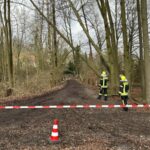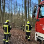 Während Besitzer einer Waldparzelle ihr Brennholz aufbereiteten, bemerkten Sie ungewöhnlich laute Knackgeräusche in der Nähe. Nachdem sie diese einige Male vernommen hatten, beobachteten sie zwei mächtige Bäume, die sich über einen Waldweg neigten. Nur die in anderen Bäumen verhakten Äste der Baumkronen verhinderten das vollständige Umstürzen. Die Waldbesitzer erkannten aus ihrer Einschätzung eine erhebliche Gefahr für die vielen Waldspaziergänger und riefen die Feuerwehr. Einsatzkräfte sperrten den stark frequentierten Waldweg zunächst ab und erkundeten die Situation. Das morsche Wurzelwerk der beiden etwa 30 m hohen Buchen hatte sich aus dem Waldboden gelöst und war teilweise abgebrochen. Mit Motorkettensägen schnitten Feuerwehrleute noch intakte Wurzeln ab und zogen die schräg stehenden Bäume mit der mechanischen Zugeinrichtung des Rüstwagens, bis die mächtigen Stämme laut krachend auf dem Waldweg aufschlugen. Einer von mehreren morschen Nadelbäumen, in denen sich die Buchen zuvor verfangen hatte, war so erheblich geschädigt, dass dieser nicht mehr standsicher war. Nachdem auch dieser umgelegt war, zersägten die Feuerwehrleute die großen Stämme und räumten diese vom Waldweg. Die zuvor gefallenen Bäume hatten zudem bei einer Eiche in etwa 20 Meter Höhe mehrere trockene Äste abgebrochen, die herabzufallen drohten. Aus dem Korb der hinzugerufenen Drehleiter entfernten die Einsatzkräfte auch diese Gefahrenstelle. Bevor der viel genutzte Waldweg letztlich wieder für die gefahrlose Nutzung freigegeben werden kann, muss in den nächsten Tagen ein Sachverständiger die Gesamtsituation fachlich bewerten. Bis dahin bleibt der Bereich abgesperrt.