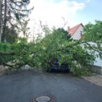 Ein großer Teil eines morschen Kirschbaumes stürzte von einem Privatgrundstück auf einen geparkten Personenwagen und versperrte die Straße vollständig. Personen wurden glücklicherweise nicht verletzt.