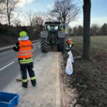 Ein Traktor eines Lohnunternehmens verlor auf der Fahrt über die Schulstraße, den Stadtweg und die Kreisstraße Richtung Leveste Hydrauliköl. Kurz vor dem Kreisel an der Nordstraße blieb das Fahrzeug liegen. Da auf dem glitschigen Ölfilm im Kreisverkehr am Gehrdener Damm bereits ein PKW ins Rutschen kam, alarmierten Verkehrsteilnehmer die Feuerwehr. Als Einsatzkräfte die Situation vor Ort erkundeten, trafen sie auf die Mitarbeitenden des Lohnunternehmens. Aus einem geplatzten Ölanschluss waren etwa 80 Liter Hydrauliköl des liegengebliebenen Traktors ausgelaufen. Feuerwehrleute streuten sofort spezielles Bindemittel in die großen Ölpfützen auf der Fahrbahn und im Grünstreifen direkt an der defekten Maschine. Parallel stumpften Einsatzkräfte den Kreisverkehr durch den Auftrag von Ölbindemittel ab und reinigten dort die Fahrbahn. Während das mit Öl kontaminierte Erdreich aus dem Grünstreifen teilweise ausgehoben wurde, trafen auch die Gewässerschutzbehörde sowie die Straßenmeisterei vor Ort ein. Nachdem der defekte Traktor auf einen Tiefladeanhäger verladen und abtransportiert war, reinigten Feuerwehrleute die Fahrbahn an der Verladestelle. Ein beauftragtes Unternehmen für Ölschadenbeseitigung setzte ein Spezialfahrzeug ein, um auf allen betroffenen Straßenabschnitten das glitschige Hydrauliköl von der Fahrbahn zu entfernen. Während des mehr als zwei Stunden dauernden Einsatzes musste der Verkehr umgeleitet werden. Es kam zu Verzögerungen im Berufs- und Busverkehr.