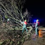 Ein auf die Fahrbahn gestürzter Baum wurde mit Hilfe einer Motorkettensäge zerteilt und entfernt.