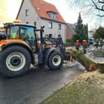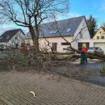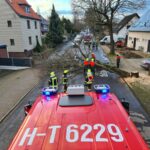 Anwohner bemerkten einen etwa 15 Meter hohen Straßenbaum, der nach dem nächtlichen Sturm eine deutliche Schiefstellung Richtung Straße und Fußweg hatte. Feuerwehr und Polizei sperrten zunächst die Straße für den Verkehr und informierten umliegende Anwohner. Nachdem diese ihre Fahrzeuge aus dem Gefahrenbereich entfernt hatten, fällten Einsatzkräfte den schief stehenden Baum mit Hilfe einer Motorkettensäge. Beim anschließenden Freiräumen der Fahrbahn wurden die Feuerwehrleute auch von einem Trecker des Bauhofes unterstützt.