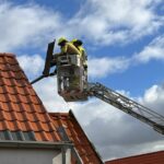 Am Giebel eines Mehrfamilienhauses hatten sich mehrere Teile einer Blechverkleidung gelöst und drohten auf den Fußweg zu fallen. Aus dem Korb der Drehleiter entfernten Feuerwehrleute die losen Bauwerksteile, die zuvor mit Hilfe einer akkubetriebenen Metallsäge vollständig abgetrennt wurden.