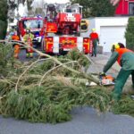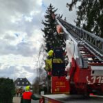 Auf einem Privatgrundstück hatte sich während des nächtlichen Sturm ein etwa 20 Meter hoher Nadelbaum deutlich Richtung Straße geneigt. Beim unkontrollierten Umstürzen wären Personen auf den Fußwegen, in Autos und auch in benachbarten Häusern erheblich gefährdet gewesen. Mitarbeiter des Bauhofes hatten sich die Gefahrenstelle angeschaut und die Feuerwehr zur Hilfe gerufen. Aus dem Rettungskorb der Drehleiter entfernten Einsatzkräfte zunächst größere Äste und die Spitze des in Schieflage stehenden Baumes. Anschließend fällten Feuerwehrleute den Stamm mit Hilfe einer Motorkettensäge und beseitigten so die Gefahrenstelle.