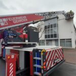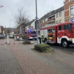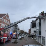 Am Giebel eines Geschäftshauses hatten sich Blechverkleidungen gelöst und drohten bei heftigen Windböen auf den nahen Fußweg oder die Straße zu fallen. Aus dem Korb der Drehleiter trennten Feuerwehrleute die Bleche mit Hilfe einer speziellen Säge ab. Danach seilten die Einsatzkräfte die Blechteile zum Boden ab, bis alle losen Teile entfernt und die Gefahrenstelle beseitigt war. Während des Einsatzes musste die Straße für den Verkehr gesperrt werden. Hierdurch konnten einige Busse die Haltestellen in der Gartenstraße und Nordstraße nicht anfahren.