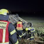 Auf der Bundesstraße 65 prallte ein PKW während der Fahrt gegen einen Straßenbaum und überschlug sich anschließend. Der verletzte Fahrer konnte das auf dem Dach liegende Fahrzeug selber verlassen. Während der Rettungsdienst das Unfallopfer medizinisch versorgte, sicherten Feuerwehrleute die Unfallstelle und leuchtete diese taghell aus. Einsatzkräfte trennten die Stromversorgung zur Fahrzeugbatterie und streuten ausgelaufene Betriebsstoffe abschließend mit speziellem Bindemittel ab.