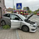 Ein Mann fuhr seinen PKW rückwärts aus der Garage, beschleunigte diesen stark und prallte gegen eine gegenüberliegende Hauswand. Der Senior konnte sein, zwischen der Hauswand und einem Verkehrsschild eingeklemmtes, Fahrzeug nicht über die verkeilte Fahrertür verlassen als Passanten den Notruf absetzten. Als kurz danach Feuerwehr und Rettungsdienst eintrafen, war der Fahrer ansprechbar. Mit Hilfe der Rettungskräfte konnte er – ohne Einsatz von Spezialwerkzeug – schnell durch die geöffnete Beifahrertür aus dem Unfallwagen geholt werden. Während der Patient im Rettungswagen medizinisch untersucht wurde, hoben Feuerwehrleute den auf einem eingefassten Blumenbeet festsitzenden Wagen mit einem Lufthebekissen an. Über eine aus Hölzern gebaute provisorische Rampe konnte der Unfallwagen auf die Straße und gleich wieder in die gegenüberliegende Garage gerollt werden. Während des Feuerwehreinsatzes musste der Verkehr auf dem viel befahrenen Straßenabschnitt umgeleitet werden.