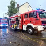 Nach einem kurzen heftigen Starkregen staute sich das viele Regenwasser in einigen Bereichen des öffentlichen Kanalsystems. In der Folge sammellte sich Niederschlagswasser in der Garagenzufahrt zum Untergeschoss eines Mehrfamilienhauses. Von hier drangen die Wassermassen in die Garagen und den angeschlossenen Keller ein. Als die Bewohner die Feuerwehr riefen, stand das Wasser bereits etwa 20 Zentimeter hoch in den Kellerräumen und stieg schnell an. Feuerwehrleute konnten den Wasserspiegel mit Hilfe von zwei großen Pumpen schnell senken. Mit speziellen Wassersaugern entfernten die Einsatzkräfte das eingedrungene Nass aus allen Kellerräumen. Nach etwa eineinhalb Stunden waren etwa 60.000 Liter Regenwasser aus dem Gebäude gepumpt.